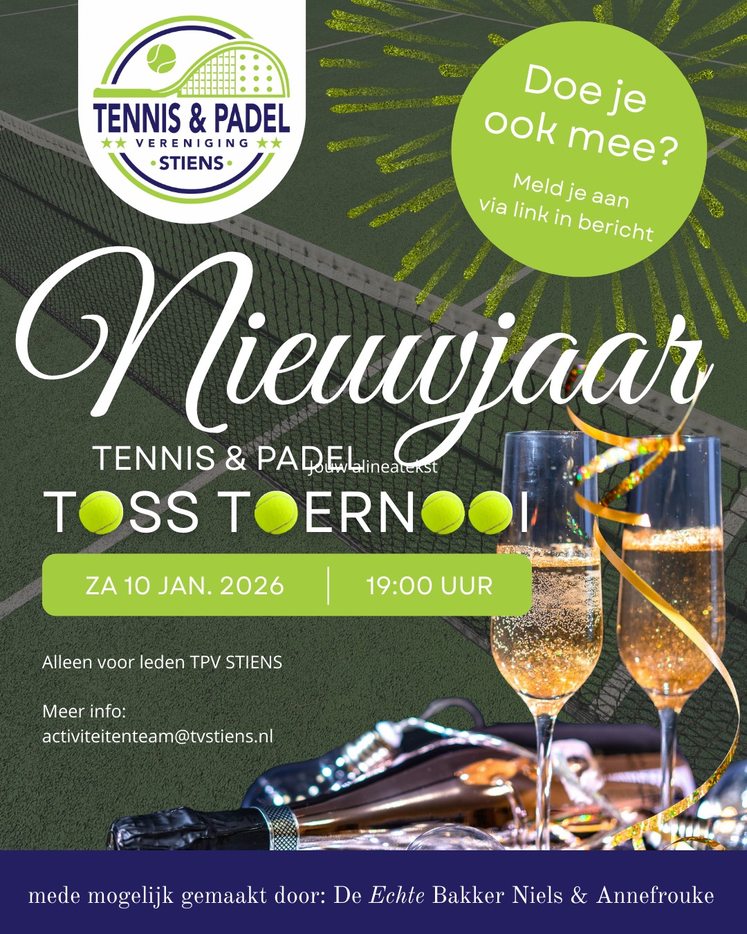Op zaterdag 10 januari 2026 organiseert de activiteitencommissie een Nieuwjaars toss toernooi voor alle leden van Tennis- en Padelvereniging Stiens. Sponsor van dit toernooi is De Echte Bakker Niels & Annefrouke.